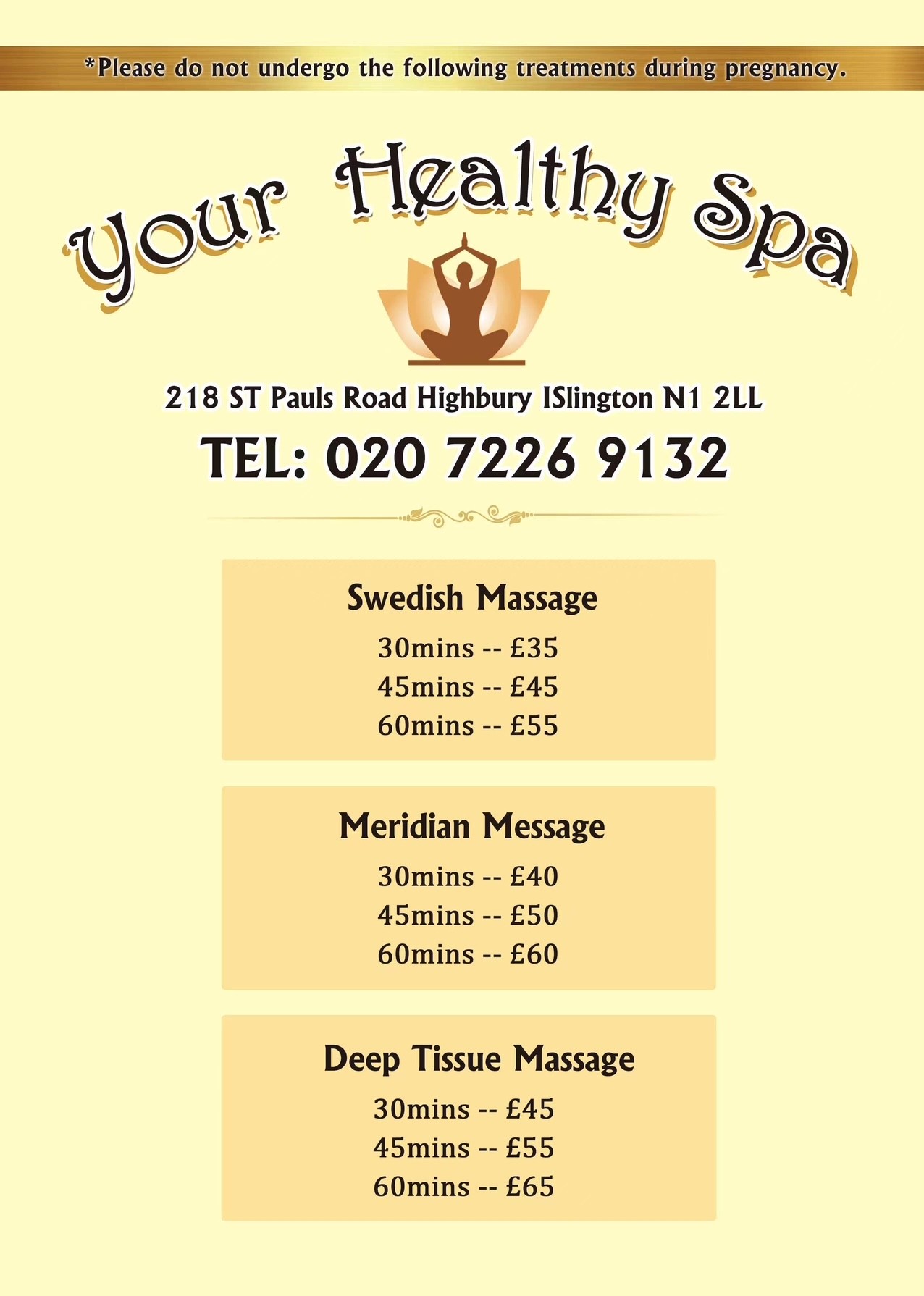 We are Your Health Spa, passionate about offering fantastic massage treatments, situated only few minutes walk from Islington High Street.